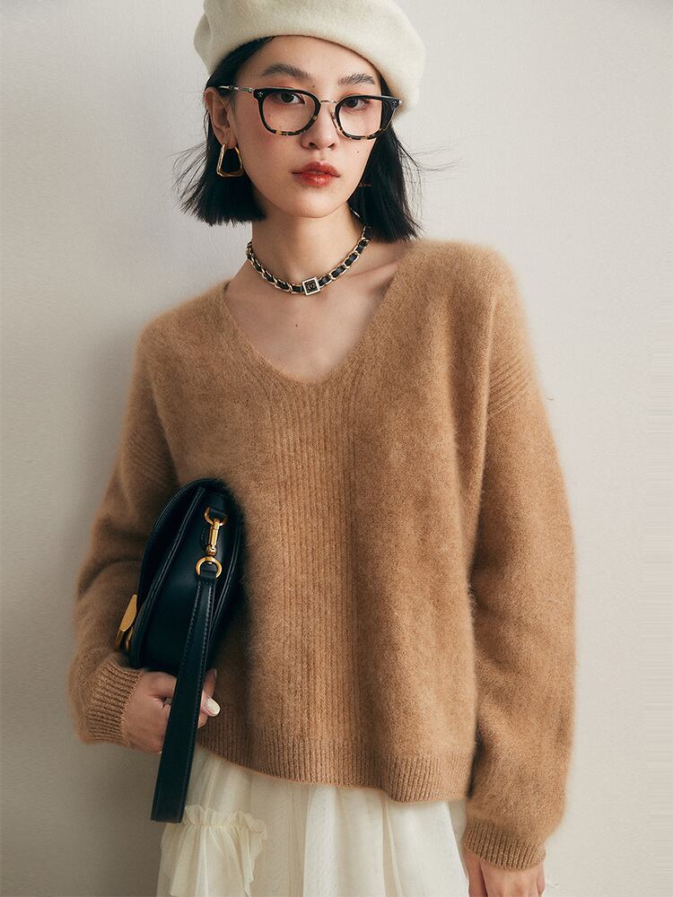 Vネックのデザインが顔周りをすっきりと見せ、どんなスタイルにも合わせやすく仕上がっています。柔らかなニット素材が心地よく、カジュアルからきれいめまで幅広いシーンで活躍します。