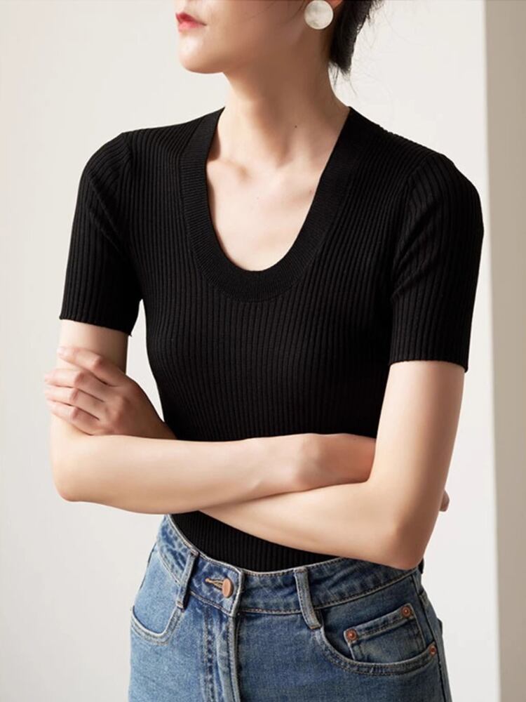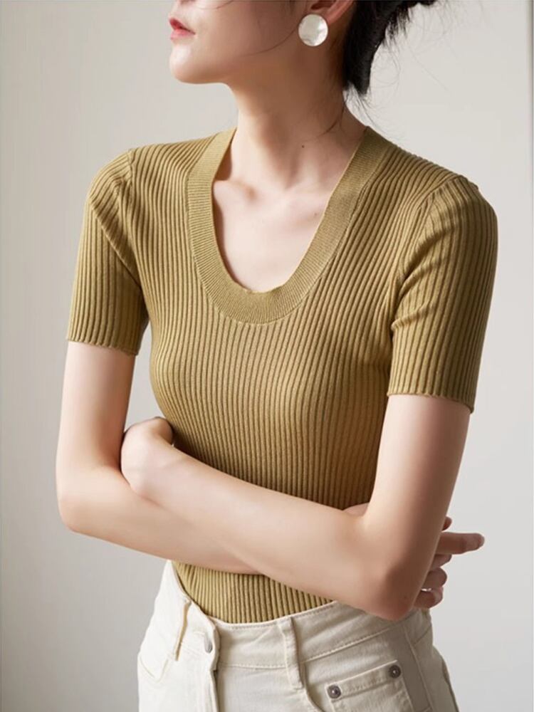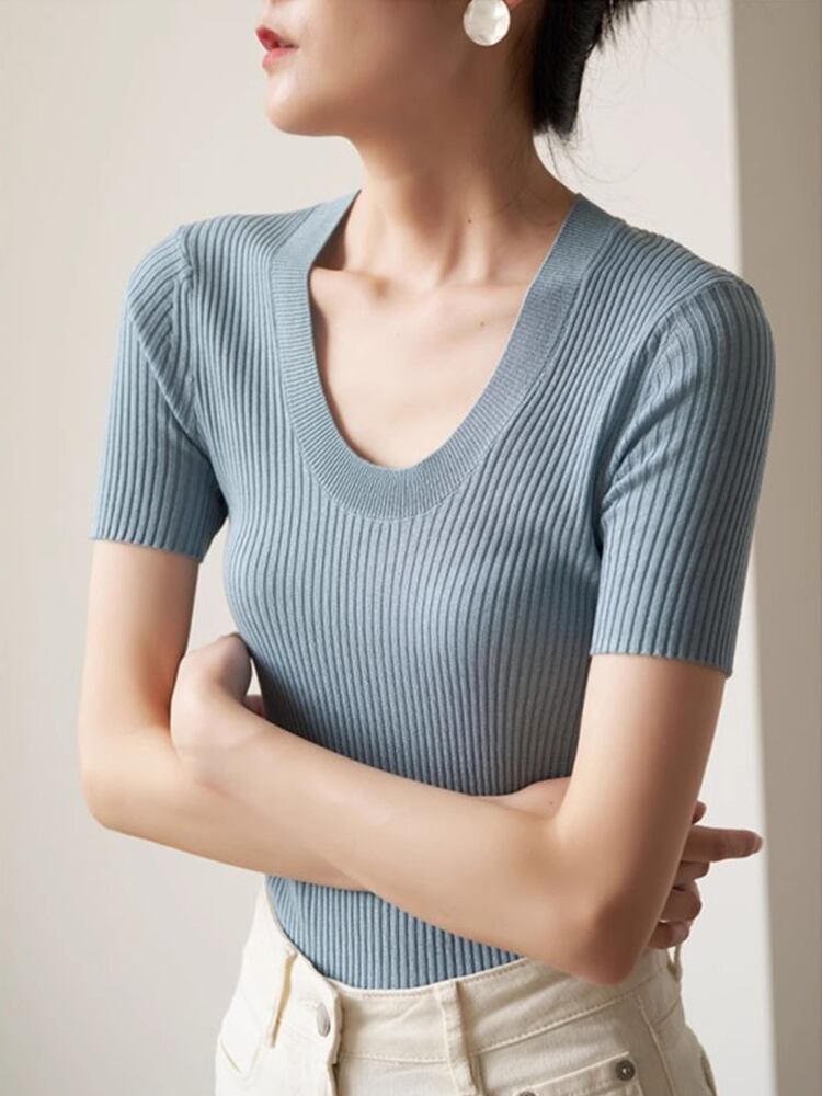 大人可愛い雰囲気の半袖Uネックカットソーです。