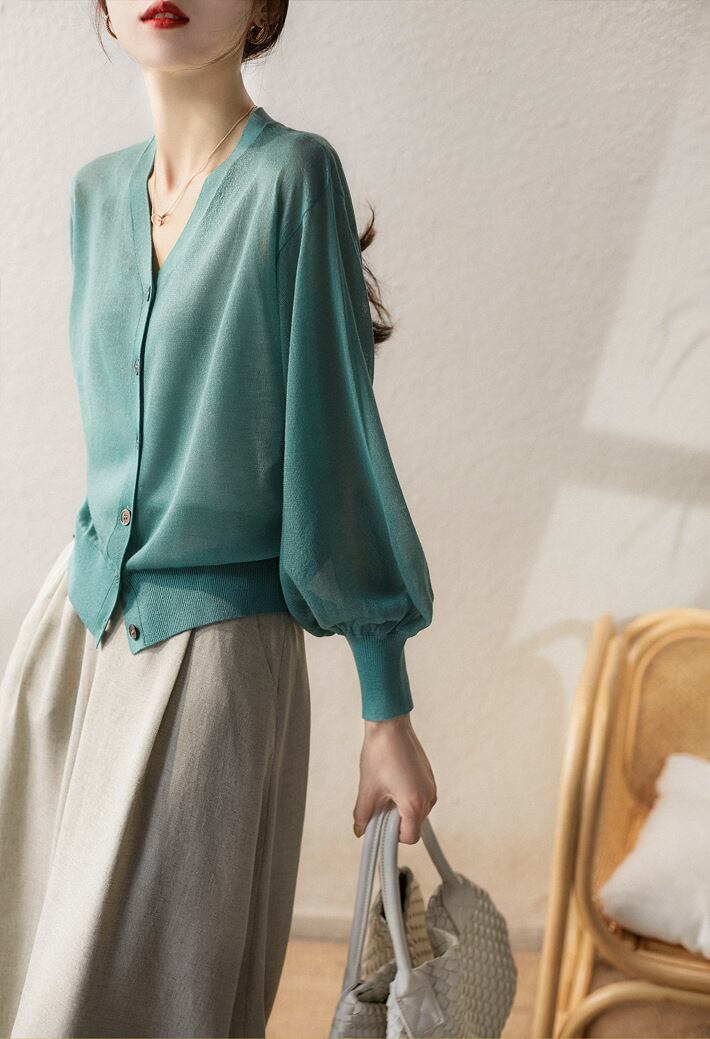 長袖でマトンスリーブが特徴的で、Vネックデザインが大人可愛い印象を演出します。