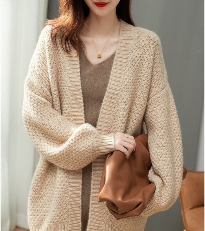 このカーディガンは、ボリューム袖とVネックデザインが特徴の長袖ニットです。