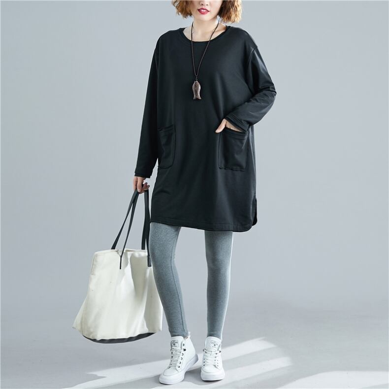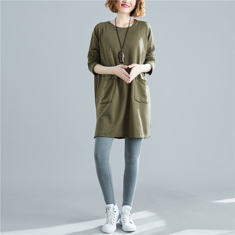 春、秋、冬のシーズンに大活躍する膝丈の長袖カットソーで、ラウンドネックデザインが大人の魅力を引き立てます。