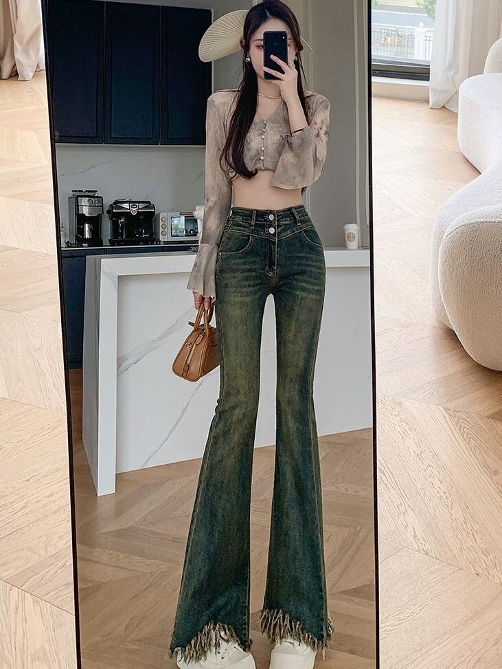 ハイウエストのデザインがシルエットを美しく見せ、ベルボトムの形状が足元に存在感を与えます。
