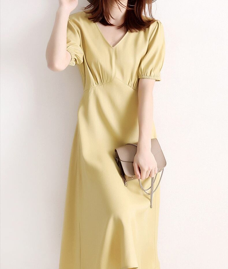軽やかなセミフレアの切り替えデザインが、動くたびに優雅に揺れ、膝丈のミディアム丈が脚長効果も期待できます。