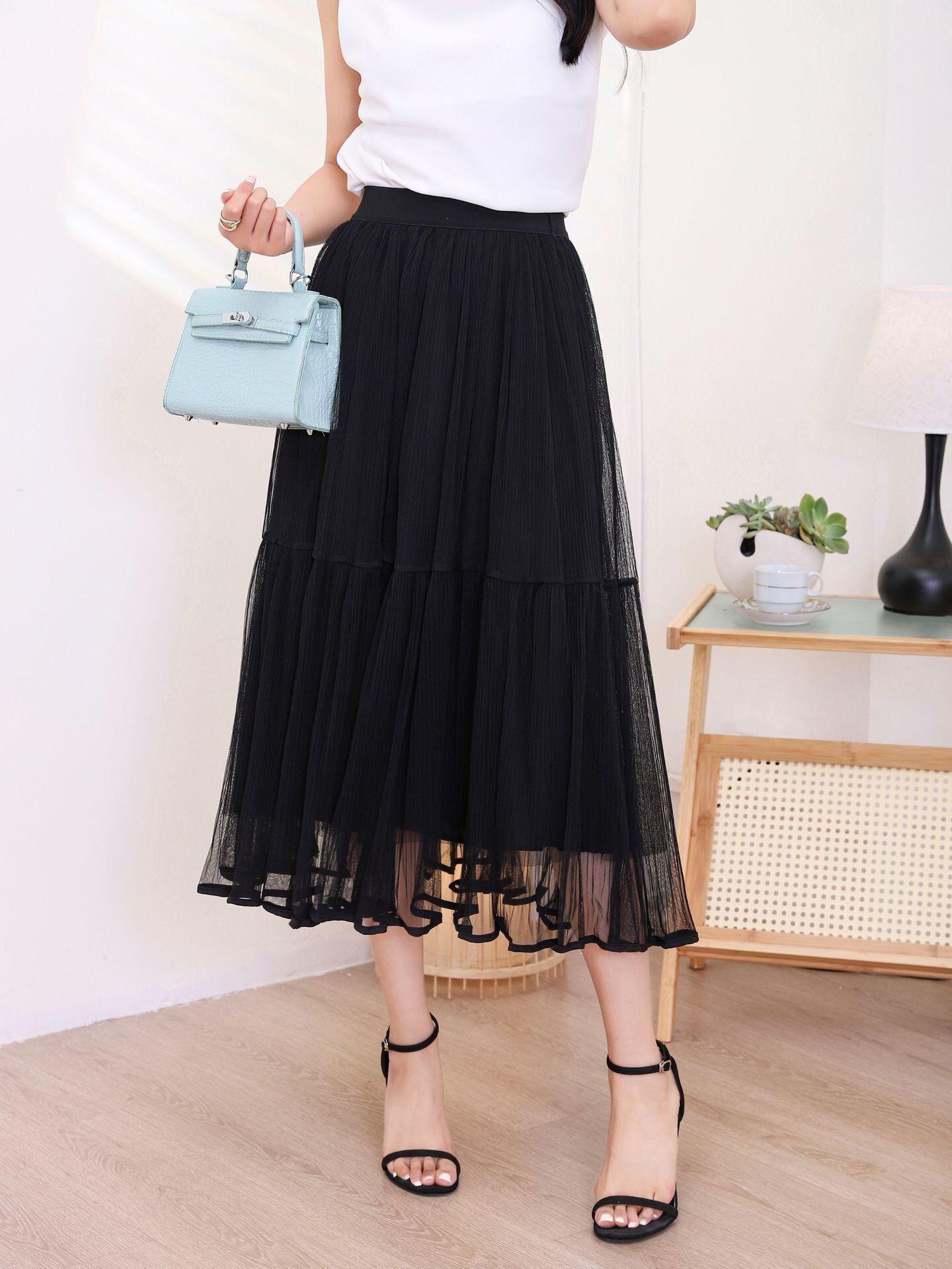 このミモレ丈のフレアスカートは、女性らしさを引き立てるハイウエストデザインで、シースルーの透け感が大人可愛い印象を与えます。