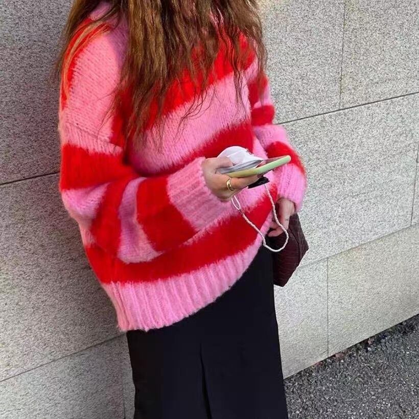 ピンクとレッドの華やかボーダーでトレンド感もバッチリな万能トップスです。