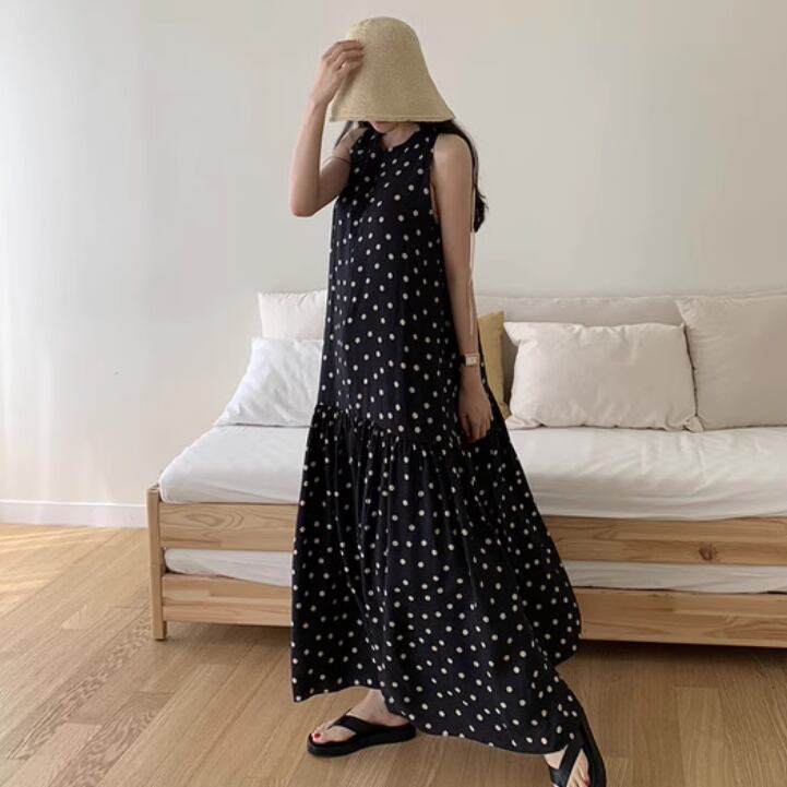ノースリーブのロング丈ドット柄ワンピーススカート