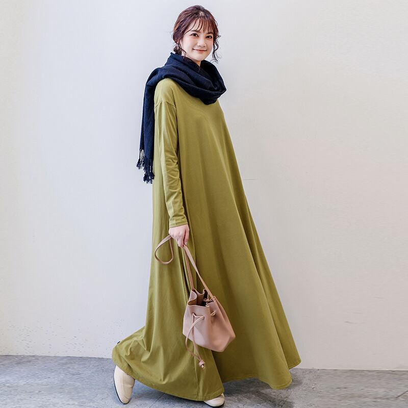 長袖とラウンドネックデザインが特徴で、フレアシルエットが優雅に身体を包み込みます。