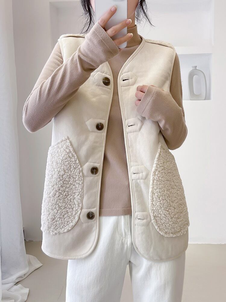 このトップス ベストは、Vネックデザインと前開きボタンが特徴で、ミディアム丈のバランスが絶妙なアイテムです。