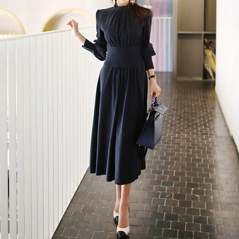 このレディースワンピースは、シンプルかつエレガントなデザインが魅力の長袖ミモレ丈アイテムです。