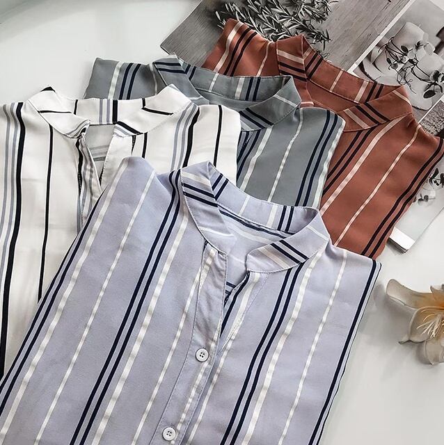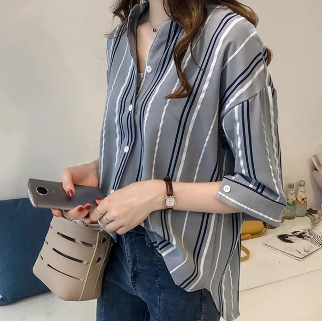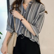 爽やかなストライプとキーネックが大人のこなれ感を演出。