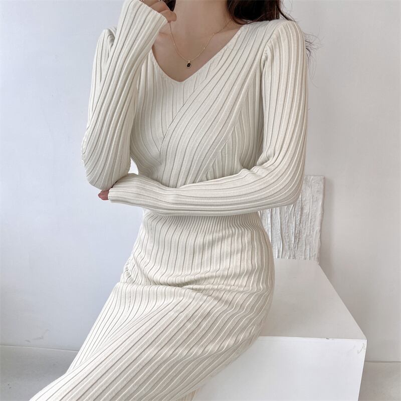 長袖とVネックのデザインが女性らしさを引き立て、ウエストマークでメリハリのあるシルエットを実現します。