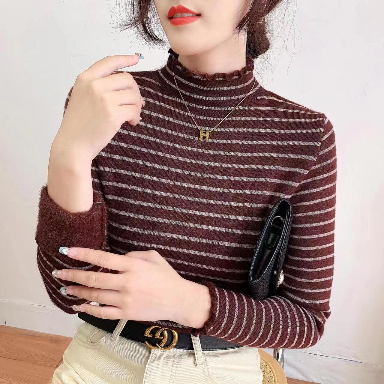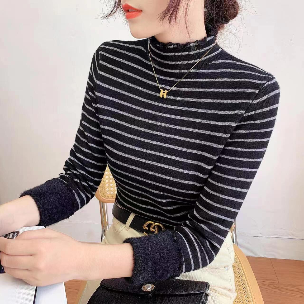 シンプルでありながら、大人可愛いハイネックデザインが特徴で、裏起毛なので肌寒い季節でも暖かさをキープ。ボーダー柄がカジュアルさを演出しつつ、上品な雰囲気を醸し出します。通勤やデート、女子会など、さまざまなシーンで活躍すること間違いなしのアイテムです。