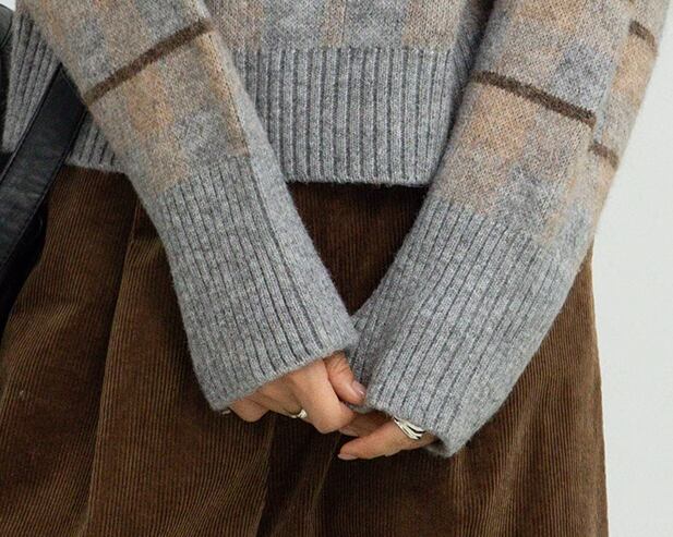 一見ボーダーに見えるチェックのおしゃれなタートルニット
