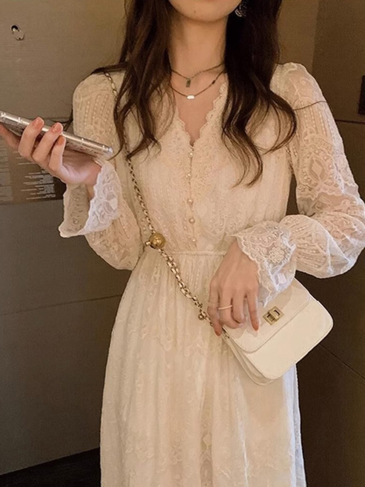 レースが女性らしさを際立て、シンプルながらも存在感のある一枚です。