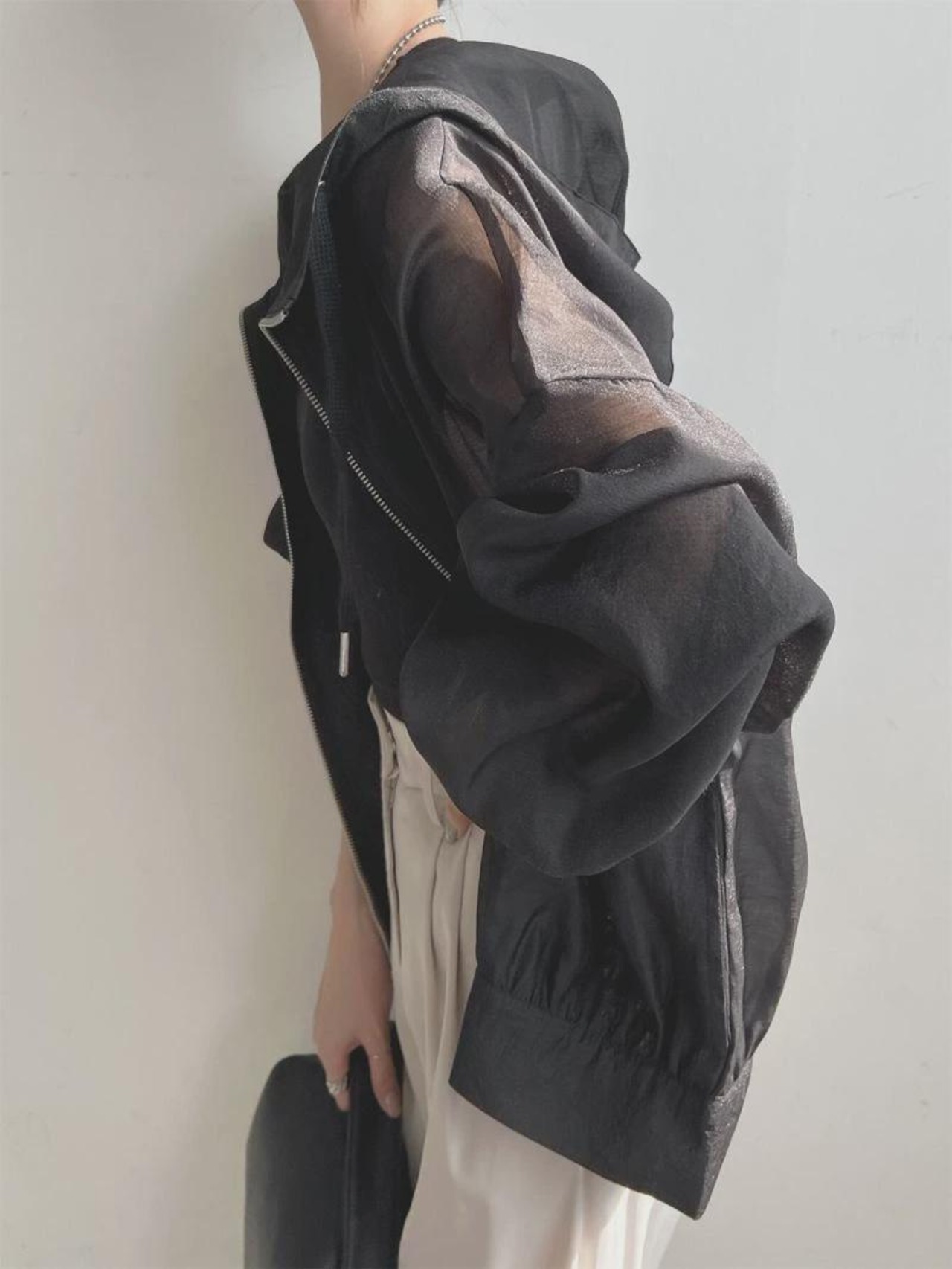 フード付きのデザインで、春秋のさまざまなシーンに最適なこちらのジャケットは、カジュアルさとエレガントな雰囲気を兼ね備えています。