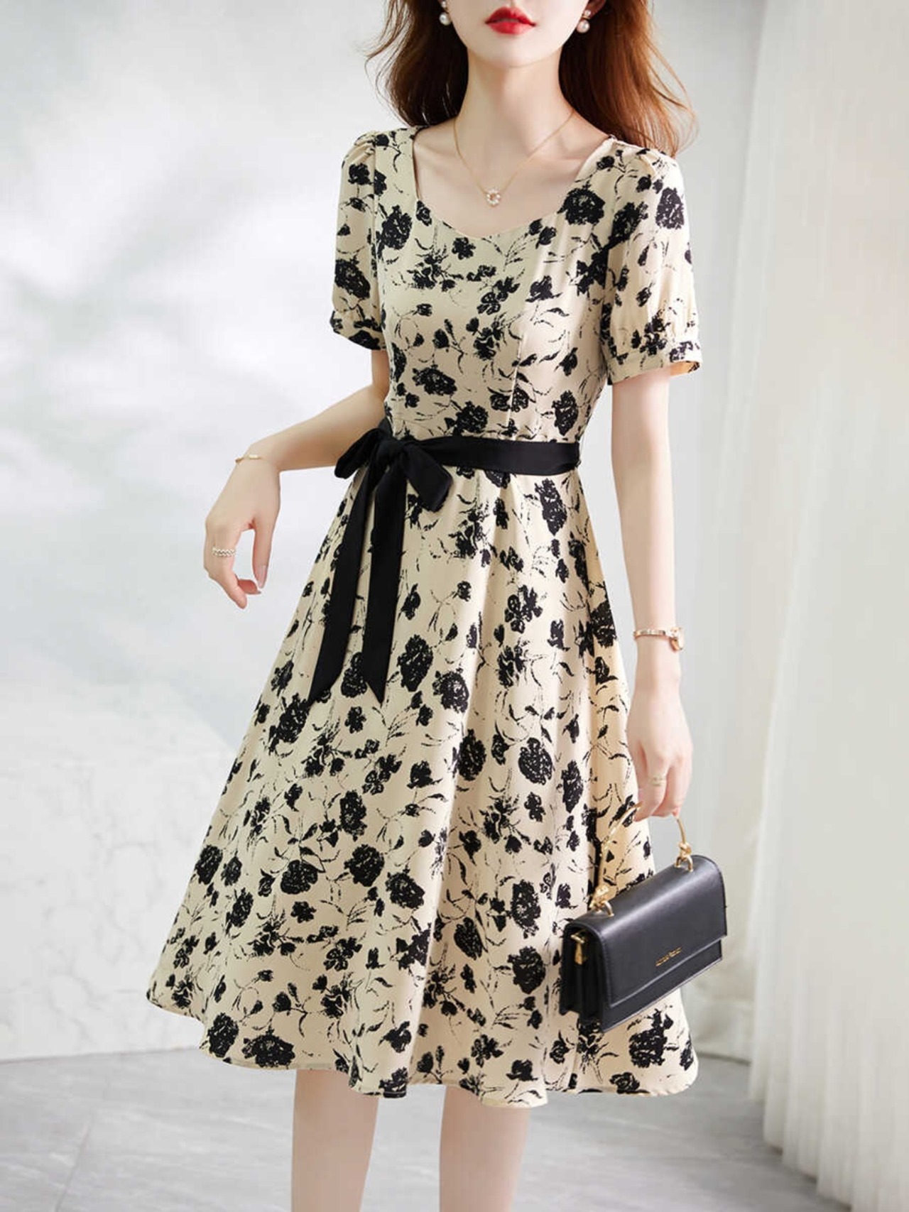 膝下のフレアデザインで、エレガントな印象に。スクエアネックが顔周りをスッキリ見せ、ウエストリボンでセクシーさをプラス!大人の女性にぴったりの主役級アイテムです。