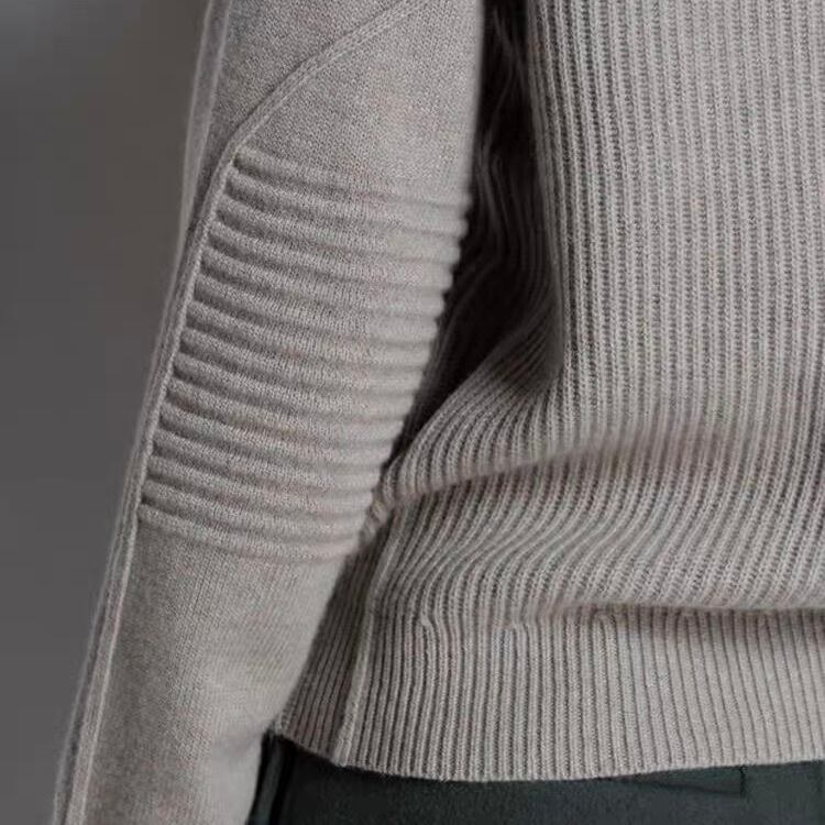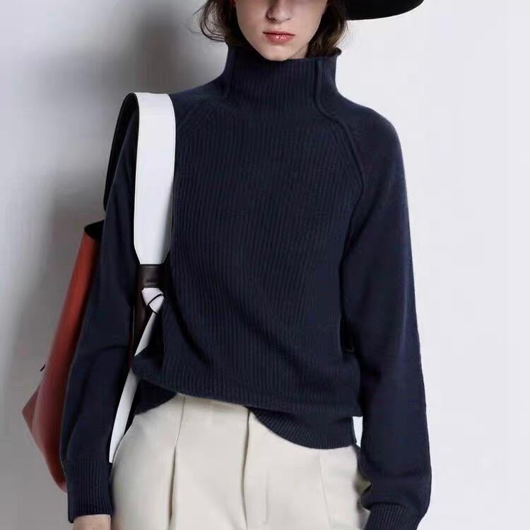 リブニットの上品な質感とハイネックの洗練されたシルエットが大人の魅力を引き立てる一枚。
