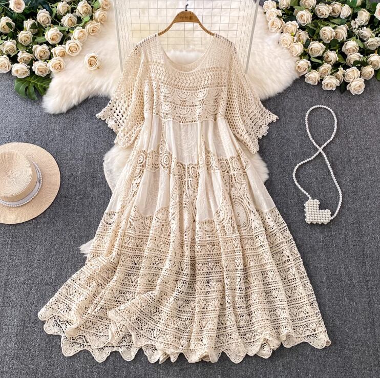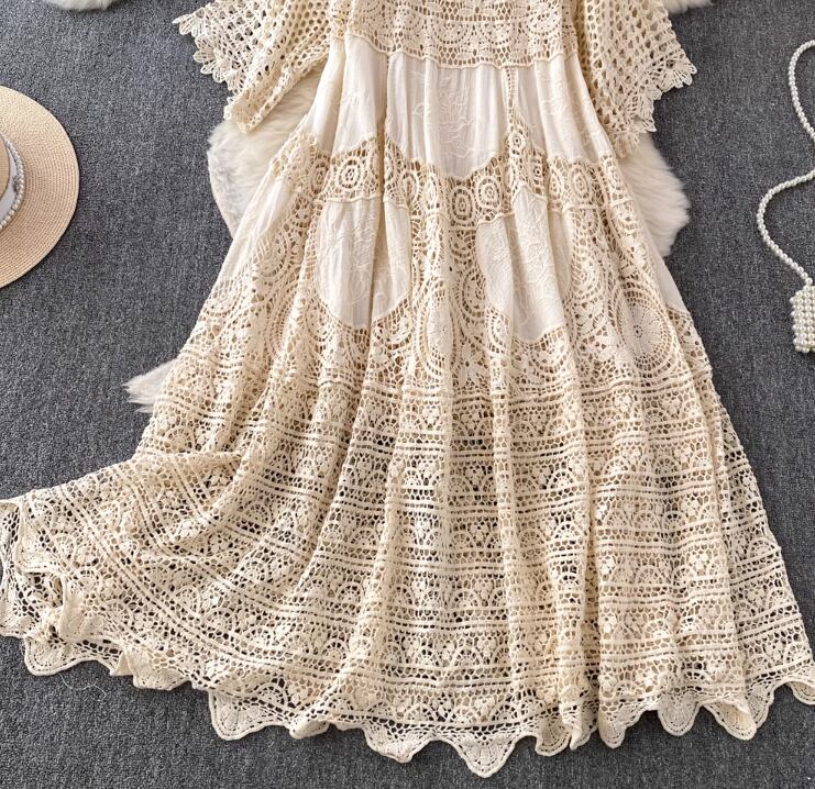 ナチュラルなかぎ針編みのフレアスリーブワンピース