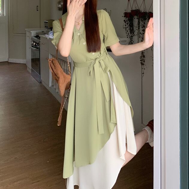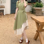 グリーン×オフホワイトの配色カラーがオシャレなシャツワンピース。
