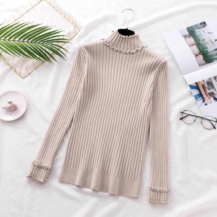 フリル袖とハイネックがフェミニンさを引き立てるリブニットセーター。