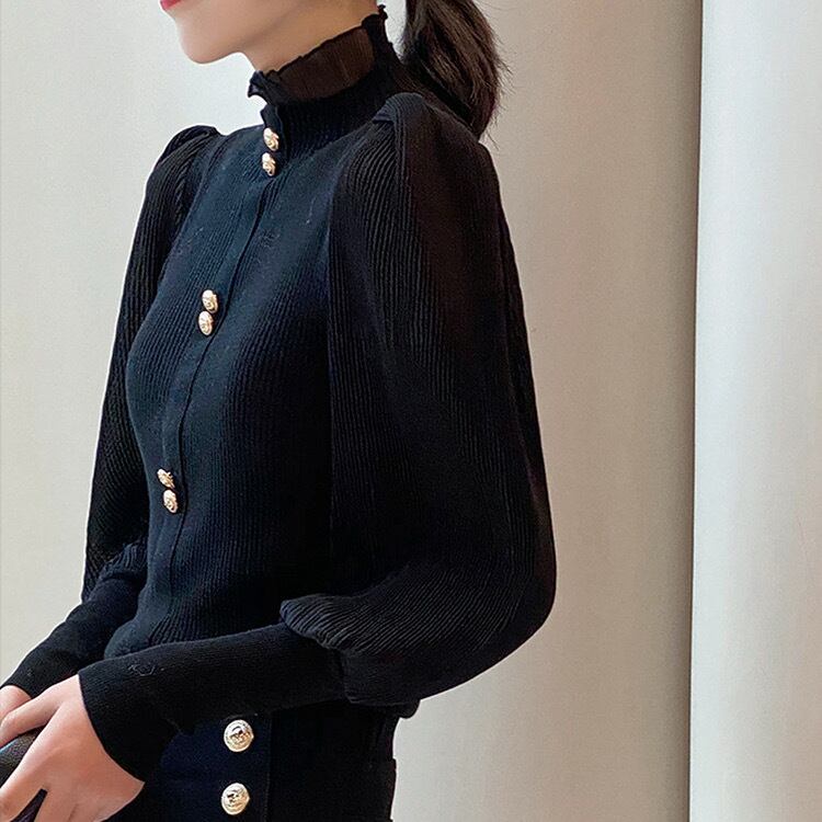 ハイカラーにドッキングされたシアーフリルやパフスリーブ、ゴールドボタンが可愛らしいデザインです。